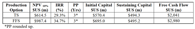 - Furnace Flash Smelter [FFS] Option – Post tax NPV (10%) $987.4 million, post tax IRR 34.7%. C1 cash cost US$2.45/lb. Initial CapEx US$695m. LOM 15 years.
