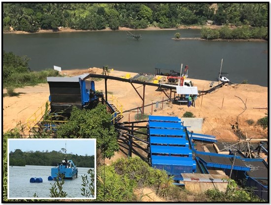 The wash plant on the shores of the Malaguit River. Insert: The dredge in action. Credit: Angkor Resources.