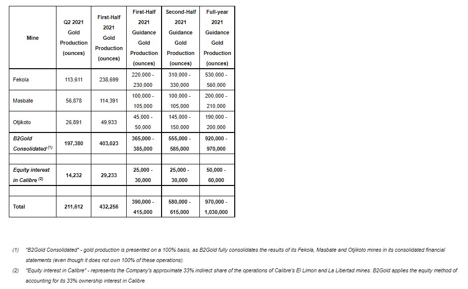 VANCOUVER, BC, August 4, 2021 /PRNewswire/ – B2Gold Corp. (TSX: BTO) (NYSE AMERICAN: BTG) (NSX: B2G) (“B2Gold” or the “Company”) is pleased to announce its operational and financial results for the second quarter and first half of 2021. The Company previously released its gold production and gold revenue results for the second quarter and first half of 2021. All dollar figures are in United States dollars unless otherwise indicated.