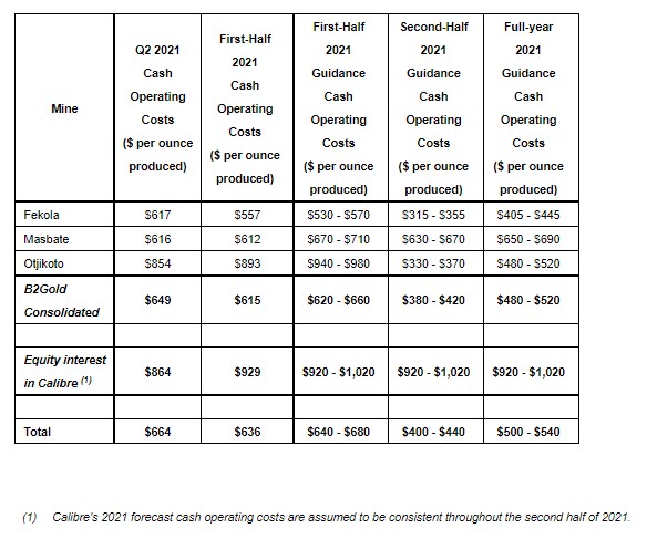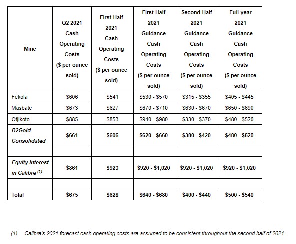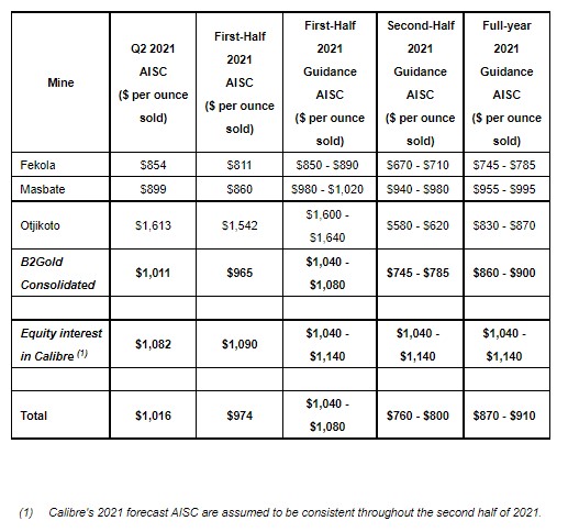 - For full-year 2021, B2Gold remains well positioned for continued strong operational and financial performance and is on track to meet or exceed the upper end of its total gold production forecast of between 970,000 – 1,030,000 ounces (including 50,000 – 60,000 attributable ounces projected from Calibre) with forecast total cash operating costs of between $500 – $540 per ounce and total AISC of between $870 – $910 per ounce