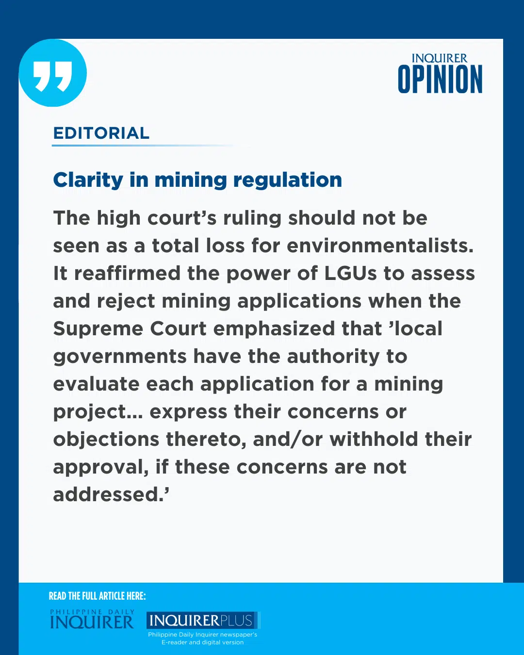The high court’s ruling should not be seen as a total loss for environmentalists. It reaffirmed the power of LGUs to assess and reject mining applications when the Supreme Court emphasized that “local governments have the authority to evaluate each application for a mining project … express their concerns or objections thereto, and/or withhold their approval, if these concerns are not addressed.’”