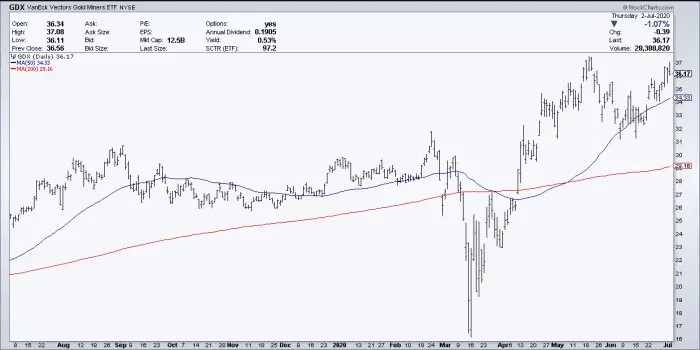 Moving over to the VanEck Gold Miners (GDX) index, we see a very similar 2x+ move up with a bullish cup pattern forming over the month of June. It as if the gold investor market is anticipating another run up amid increasing concerns over a second wave of COVID infection breakout in the US.