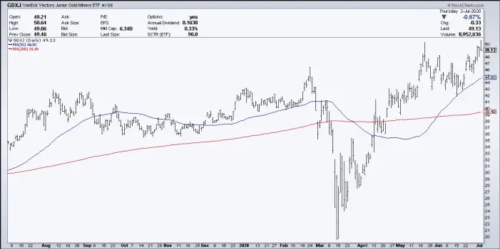 Here is the VanEck Vectors Junior Gold Miner Index (GDXJ). This indicates more upside momentum with less hesitation by junior gold mining investors who were piling into the various junior gold stocks.