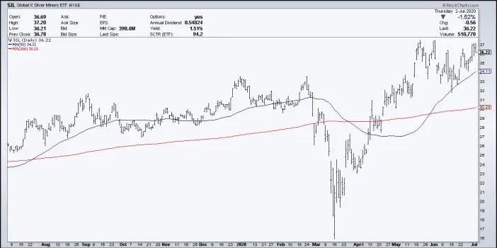 Here we will look at the Global X Silver Miners ETF (SIL) and we see that it experienced about a 2.3x move to the upside. The fund had a very shallow cup formation in June, but investors are clearly anticipating larger moves in silver to address that abnormal high in the gold silver ratio.
