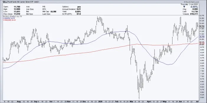 The silver junior mining chart is similar, but you can clearly see more volatility in the silver juniors than in the majors. Looking at the PureFunds ISE Junior Silver Index (SILJ), we see a similar 2.4x move to the upside with a shallow cup formation in June.