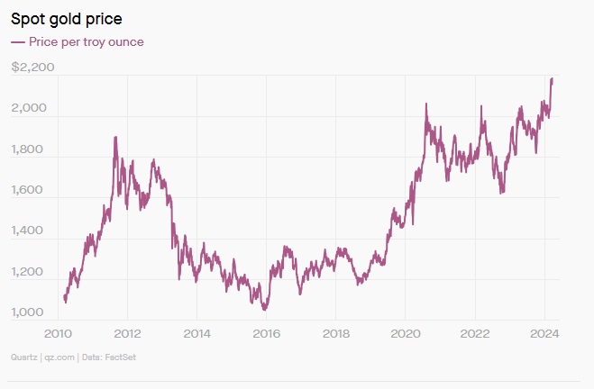 Gold is hard to pin down. It means a lot of different things to a lot of different people. But it’s desirable and expensive, which has made a consistent fulcrum of financial speculation for centuries. Even Costco is trying to get in on the action by selling gold bars alongside cheap hotdogs and giant boxes of household goods. In fact, Bitcoin has long been thought of a sort of digital parallel to gold, with all the same animal spirits driving it. But as the precious metal hits a new record — it’s at nearly $2,200 a troy ounce in Thursday trading — investors could be forgiven for trying to find a reason for its continued rise.