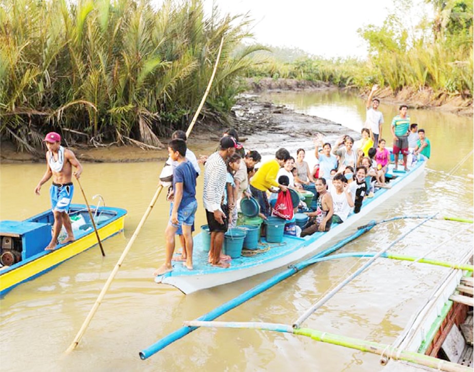 BOATLOADS OF RESIDENTS CAME FOR AID – Residents from a nearby island fill the boat which brings them to Filiminera ‘s gift-giving operations.