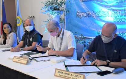 MOA SIGNING. Negros Occidental Governor Eugenio Jose Lacson (2nd from right) and Mines and Geosciences Bureau-Western Regional Director Raul Laput (right) sign the memorandum of agreement for the transfer of functions on the processing and issuances of two mining documents to the provincial government. Witnessed by Provincial Administrator Rayfrando Diaz II (2nd from left) and Provincial Environment Management Office head Julie Ann Bedrio, the signing rites were held during the Governor’s Permit Holders Forum and Dialogue held at the Negros Residences in Bacolod City on Tuesday (April 12, 2022). (Photo courtesy of PIO Negros Occidental)