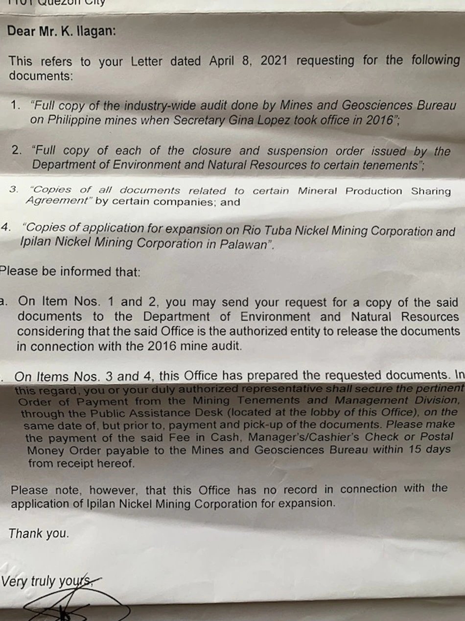 A copy of the Mines and Geosciences Bureau’s response to PCIJ’s request for a copy of the mine audit reports. Source: Mines and Geosciences Bureau