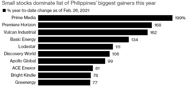 All but one of the 10 biggest gainers in the country in 2021 have a market value of less than $171 million. The sole exception, Apollo Global Capital Inc., is worth $1.47 billion — about as much as the smallest of the 30-member Philippine Stock Exchange Index. That benchmark is down more than 4.8% this year.