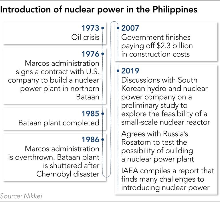 The Philippine government has already called on other countries to provide expertise. In 2019 it consulted with South Korea’s Korea Hydro and Nuclear Power over preliminary investigations to explore the feasibility of small nuclear reactors. It also agreed with Russia’s state nuclear corporation Rosatom to examine the possibility of constructing a nuclear power plant. A Rosatom executive reportedly proposed the introduction of offshore floating nuclear power plants. Discussions could extend further depending on the results in January of the committee’s examination.