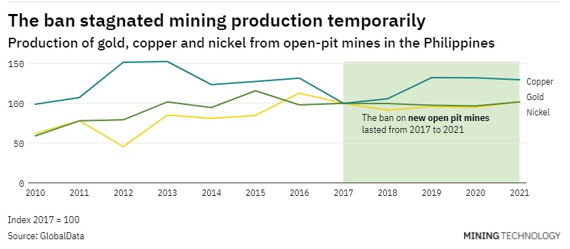 Data from GlobalData shows that the ban caused a temporary stagnation of the production of commodities through open-pit mining. No new mining projects started operations after 2017, as the ban put the development of some big mining projects on hold, such as the King-King project in the south of the Philippines.